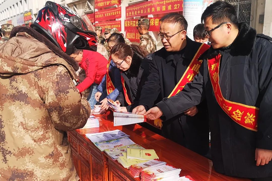 王涛(右二)和同事们用农牧民群众喜闻乐见的方式和听得懂的语言开展普法宣传,提供法律服务。