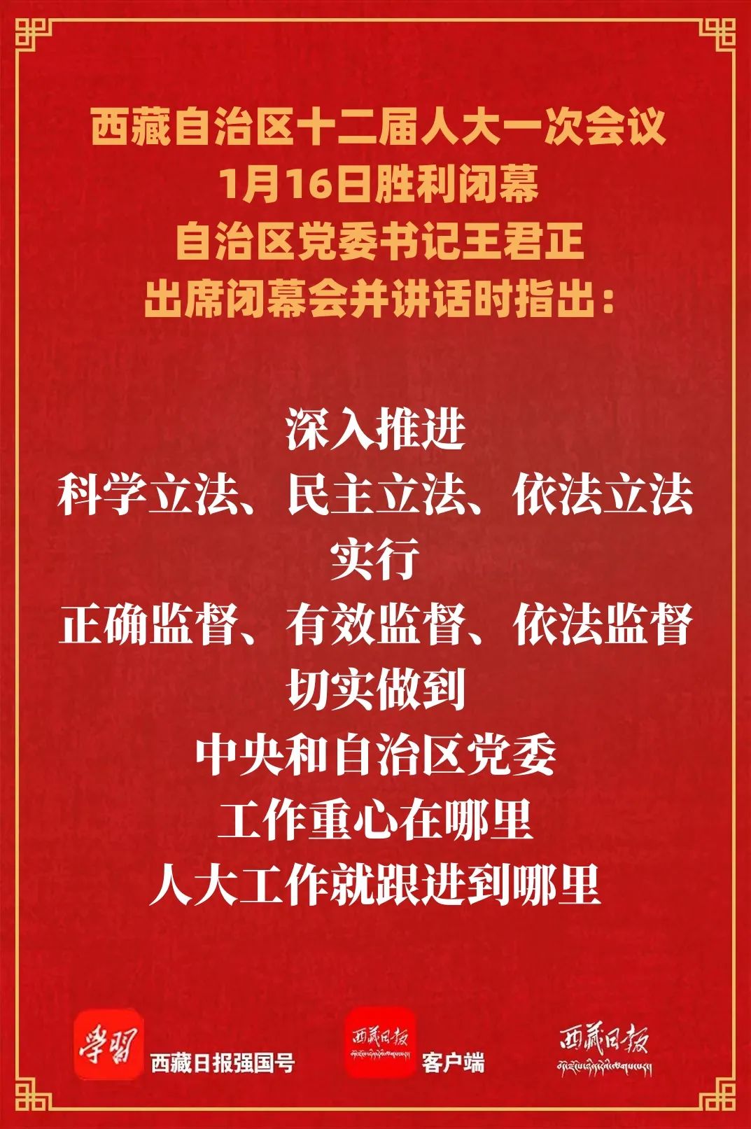 王君正在讲话中指出,自治区十二届人大一次会议,经过全体代表共同努力,圆满完成了各项议程。会议期间,代表们以饱满政治热情,认真履行职责,依法行使权利,展示了奋发向上、团结进取的精神风貌。会议充分发扬民主、广泛凝聚共识,是民主团结、务实创新的大会,是统一思想、凝心聚力的大会,必将进一步鼓舞和激励全区各族人民以更加坚定的信心、更加昂扬的斗志、更加务实的作风,开创社会主义现代化新西藏建设新局面。